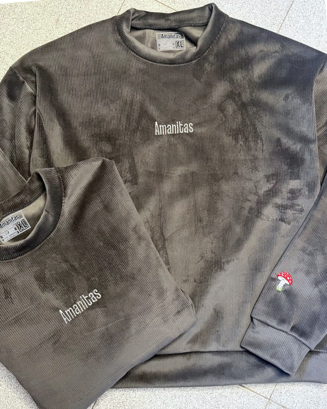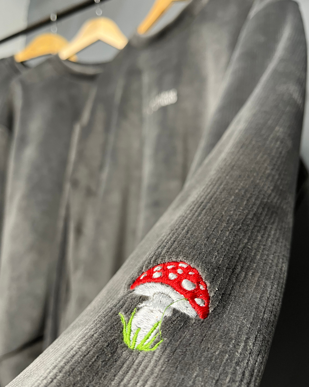 • Un hongo Amanitas bordado en la manga 🍄 – símbolo de magia, naturaleza y transformación.